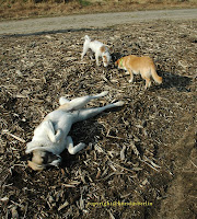 Erst, kaum, dass wir den Transporter halbwegs sicher abgestellt, ein neues Areal für uns entdeckt hatten, spürten Noccino und Lara ein Wildschweinrudel auf...ich denke, es war ein glücklichwer Umstand, dass die ca acht Tiere nicht in unsere Richtung stoben, sondern das Weite suchten. Kurz darauf trottete Lara wieder in ihrem nervenraubenden -ichhabmiteuchallenixzutun-Tempo durch die Gegend, bis sie plötzlich ungeahnte Schubkraft vorlegte - und siehe da, eine Horde Rehe war Laras Aphrodisiakum, sie jagte, was das Zeug hielt und ich sah schon mein Rudel in Auflösung begriffen. Glücklicherweise überzeugten die Rehe durch ihre Geschwindigkeit, Lara kam nach etwa 10 min Herzklopfen meinerseits zu uns zurück und entschied sich dann doch, hinter den albernden und sich jagenden anderen Rudelmitgliedern hinterdreinzutraben.