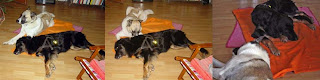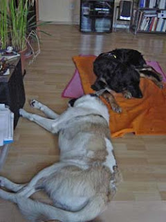 Wieder so ein Tag: erst lauter halsstarrige, alterswahnsinnige Autofahrer, natürlich verkehrserzieherisch und absolut unflexibel unterwegs stressende Männer ab Siebzig hinterm Steuer...Dann der erste Schock: Mit Bobby und Sky gassigehenderweise auf dem Bürgersteig, Bobby ja eh immer an der Leine, dann Sky rangerufen, ein Kindergartenausflug naht....na, denke mal niemand, dass die sehen, dass ich Sky am Halsband festhalte, um sie vorbeizulassen, während mein Meister Propperschnüffelnase dringlichst weiter möchte, weil die Spur da grad so lekker ist. Nö, die Kids wollen die Hunde streicheln, die Erzierherinnen erstarren und wir spielen alle Ice Age.. na toll. ick habs eilig, Kinnings.Dann die nächste Schlappe, bei Booby zuhaus zertrümmert Sky mal eben im Vorbeigehen Bobbys niedliches Plastiknäpfchen, in dem der Kleine seine MiniSeniorpackung Whiskas (ach ne, das ist die katzenversion;=) kriegt...super, ich verspreche Bobbys Besitzerin einen neuen Napf und Bobby muss für heute wahrscheinlich hungern. Sorry, Bobbele.